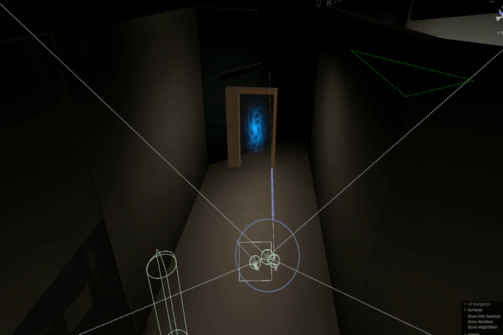 The player character's main collider (see green capsule) can be offset from their perceived location, dictated by the camera. This happens when the player moves around freely in the real world. This is not an issue, for such movement makes the application much more immersive, and the player collider shouldn't prevent such movement in any way. With teleporting around, the player's main collider is not reset to the camera position. This is an issue because this collider is used to detect the player's position, which can result in teleporting portals not detecting when the player tries to use them (see figure below, green box is the portal's detection area).
