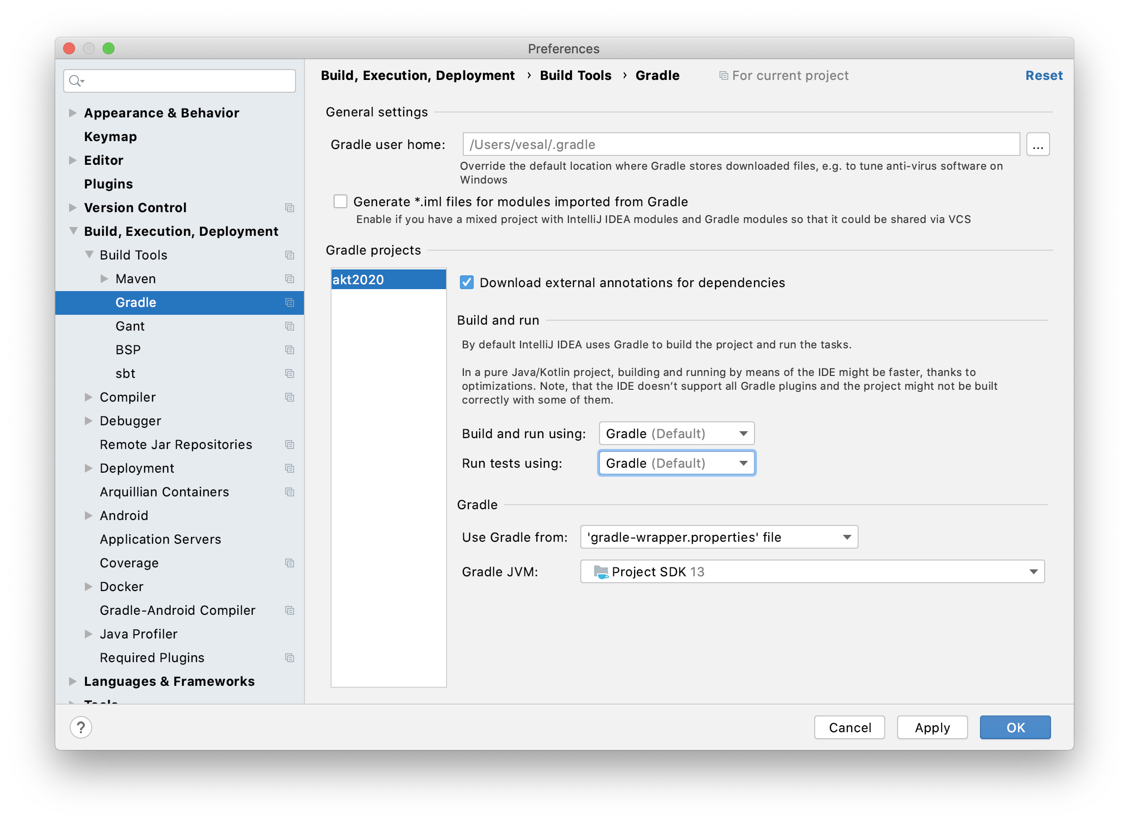 Uuemad IntelliJ versioonid oskavad Gradle'i kaudu koodi kompileerida ja teste käivitada. See peaks olema vaikimisi seadistus, aga IntelliJ seadetest saad üle kontrollida siit: