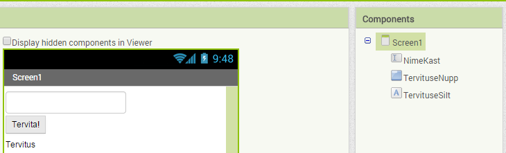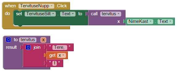 Ja nüüd blokkide vaates programmeerime, et alamprogrammi tervitus kasutades näidatakse sildil tervitust.