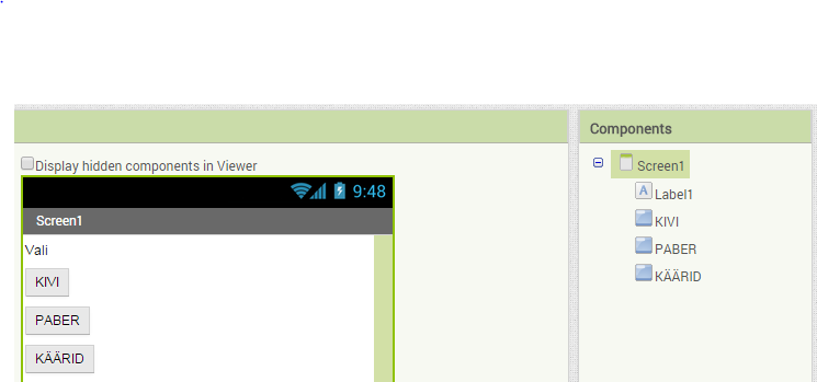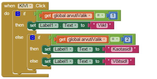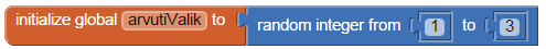 Mida see random integer from 1 to 3 tähendab? See tähendab, et muutuja arvutiValik saab väärtuseks täisarvu, mis jääb vahemikku 1 kuni 3. Ehk muutuja arvutiValik saab väärtuseks kas 1, 2 või 3. Kui nüüd mõelda, et 1 on kivi, 2 on paber ja 3 on käärid, siis saame vastavalt ka teada, kas võidab kasutaja, kes vajutas nuppu või arvuti, kes valis suvalise arvu. Seega programmeerime iga nupuvajutuse eraldi, arvestades seda, et