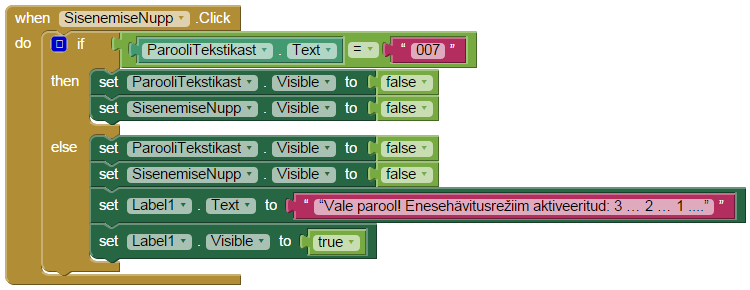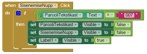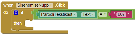 Meil tuleb kontrollida, kas parool on õige või ei ole. Selleks saab kasutada tingimuslauset, (if..), mis kontrolliks, kas parooli tekstikastis olev tekst on võrdne mingi salasõnaga. Teeme nii, et selleks salasõnaks oleks 007. Seega saame: