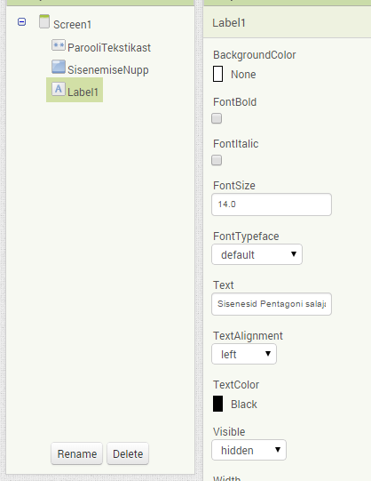 Nüüd tuleks koodi lisada, mis juhtub, kui parool on õige. Selleks lisame projekti ühe sildi (Label), kuhu saaks tekstiks kirjutada “Sisenesid Pentagoni salajasse serverisse!”. Lisame selle sildi nii, et see on alguses nähtamatu.