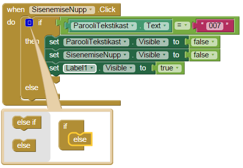 Küll aga on meil antud programmist puudu kood, mis juhtub siis, kui parool on vale. Selleks kasutatakse järgnevat else-lauset, mille saab lisada if-lause sinist nupukest vajutades: