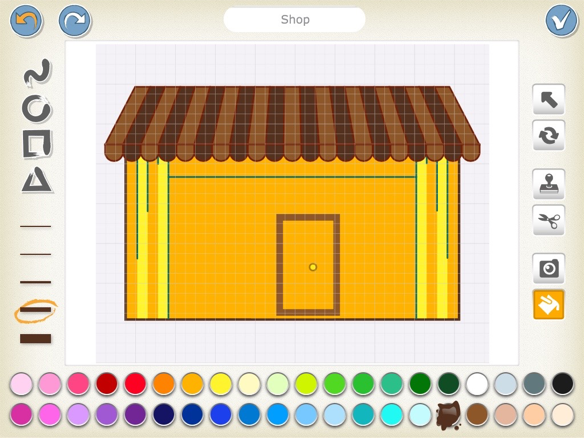 Lauda joonistamiseks tuleks esmalt otsida üles objekt “Shop” ning seejärel valida värvida seinad ja katus sobivat värvi (abiks värviämber parempoolses menüüs). Kui katus ja seinad on värvitud tuleks värvida ka aknad ja silt (sama värvi, mis silt) ning seejärel joonistada uus uks (ruudu joonistamine) ning uksele link (ringi joonistamine).