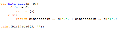 Üks ülesanne, mis ilma rekursioonita on päris keeruline lahendada, on kõikide variantide läbivaatamine. Näiteks järgnev kood genereerib kõikvõimalikud bitijadad pikkusega n. Näiteks n=2 korral on nendeks: "00", "01", "10" ja "11".