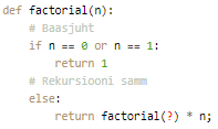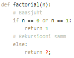 Sinu ülesanne on nüüd koostada faktoriaali leidmise programm, kasutades rekursiooni. Siin on esialgne programm, mõtle välja, mis peaks minema punase küsimärgi asemele, et saada rekursiooni samm.