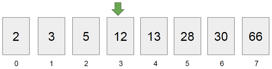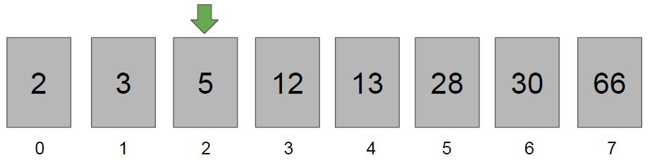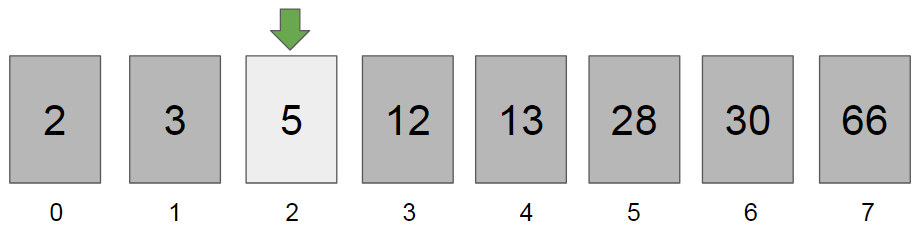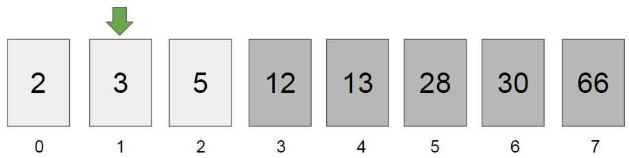 Näide: Otsime alltoodud sorteeritud järjendist arvu 4. Hallid kaardid tähistavad järjendi elemente ning iga kaardi alla on märgitud ka tema positsioon järjendis. Nagu näha, siis arvu 4 selles järjendis ei leidu ning seega peab samale järjeldusele jõudma ka otsingu algoritm. Esmalt vaatab algoritm järjendi keskmist elementi, kui elemente on paaris arv, valime näiteks väiksema. Joonisel on tähistatud vaadeldav element rohelise noolega.