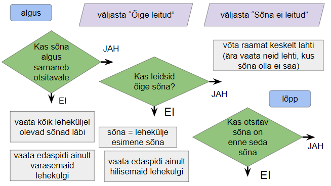 Sellist algoritmi polnudki kõige lihtsam kirjeldada ning ülesandele lisas keerukust see, et kõigepealt on tarvis üles leida sobiv leht ja seejärel sealt sealt õige sõna. Õnneks on arvutis andmed enamasti järjest ning peab vaid teadma õiget kohta, kust vaadata. Kui sa võtsid sõnaraamatu keskelt lahti, oled aga juba poole lähemal järgmisele algoritmile.