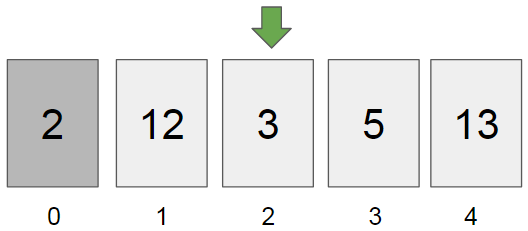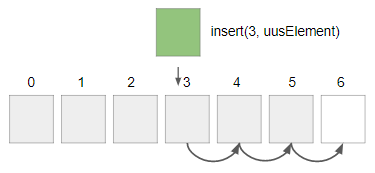 Erinevalt aga kaardipaki sorteerimisest ei saa sorteerimise puhul elemente lihtsalt järjendi keskele pista, kuna arvuti mälus asuvad kõik andmed üksteise kõrval järjestikku. Kuigi Pythonis on olemas insert() meetod, mis võimaldab elemente lisada ka järjendi keskele, siis tegelikult peab ta selle jaoks ruumi tegema, ehk kõik järgnevad elemendid ühe võrra edasi kopeerima. Seda on kujutatud järgmisel joonisel: