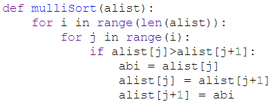Järgnev algoritm sorteerib järjendi kasutades mullimeetodit. Tegemist on ühe lühima sorteerimisalgoritmiga, kuigi see pole eriti kiire.