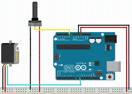 Alustuseks konstrueerime eelmisest peatükist tuttava vooluahelaga (vt kõrval olev pilt) üsna sarnase vooluahela, millel on lisaks potentsiomeetrile ühendatud ka üks servomootor.