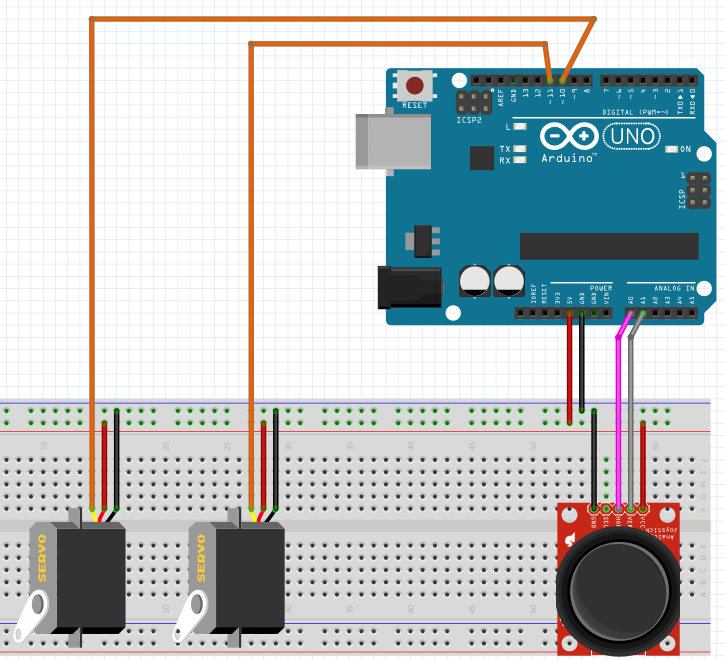 Alustuseks konstrueerime nii meie üheksandast tunnist tuttava juhtkangi vooluahelaga kui ka käesoleva tunni eelmises osas ühte servot ja potentsiomeetrit sisaldava vooluahelaga üsna sarnase vooluahela: ent meil on nüüd konstrueeritavas vooluahelas kaks servot, mida juhime kahe potentsiomeetriga—st juhtkangi (joystick) abil.