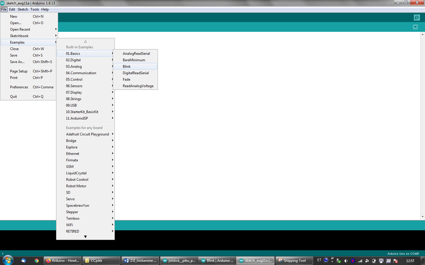 Kuna me aga sellel tunnil veel prototüüpimisplaati ei kasuta, siis vaatame, kuidas saame ilma midagi Arduino UNO külge ühendamata vilgutada Arduino UNO- viigul number 13 asuvat sisseehitatud LED-i: viik 13 sobib Arduino UNO-l just sisseehitatud LED tõttu selliseks esimeseks katsetuseks.
