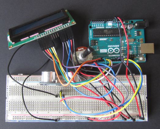 Tuletame meelde, kuidas 19. peatükis mõõtsime ultrahelianduriga kaugust. Meil oli punase värvikoodiga tähistatud toitejuhe, musta värvikoodiga maaühendus. Neile kahele lisaks kasutasime veel kahte eraldi värvidega tähistatud juhet—ühega kontrollisime ultrahelisaatjalt välja saadetavat ultrahelisignaali (Trig-tähistusega viik) ning teiselt peegelduse vastuvõtmise registreerimist (Echo- tähistusega viik). Kui fototakistil oli kaks viiku, infrapuna-anduril oli kokku kolm viiku, siis ultraheliga toimetaval HC-SR04 kauguse-anduril oli vaja ühendada juba neli viiku.