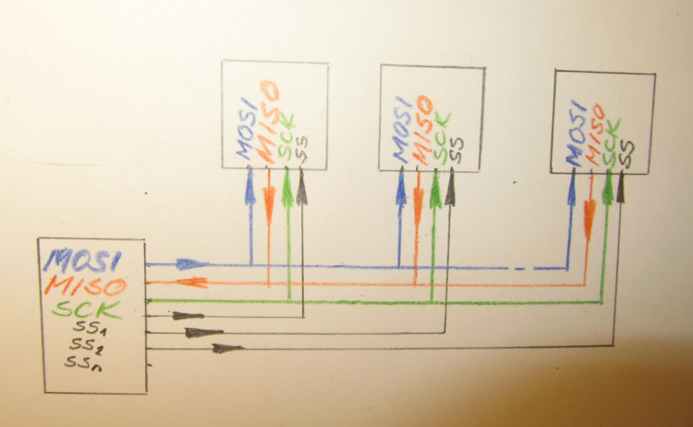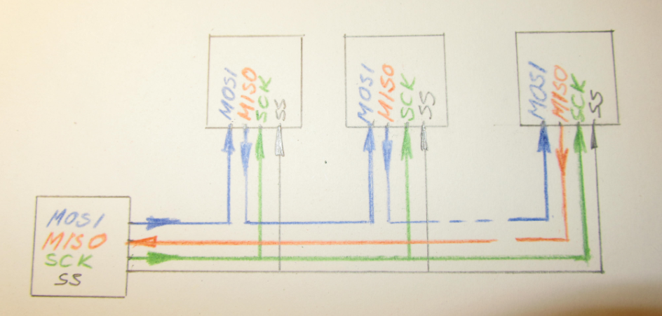Näitlikkuse huvides „täiendame“ I2C kohta tehtud omakäelist joonist: SDA asemele peame panema MOSI ja MISO ühendused.