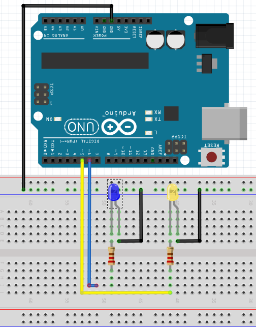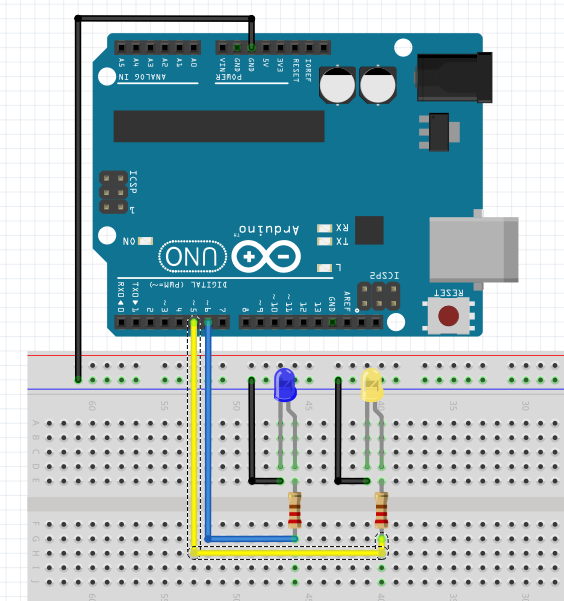 Selleks, et vilgutamise osa oleks paremini programmeeritav ja programm paremini loetav, õpime tundma for-tsükliga kordade arvu määramist. Oletame, et meil on vaja, et sinine LED plingiks üheksa korda järjest ja kollane LED viis korda järjest.