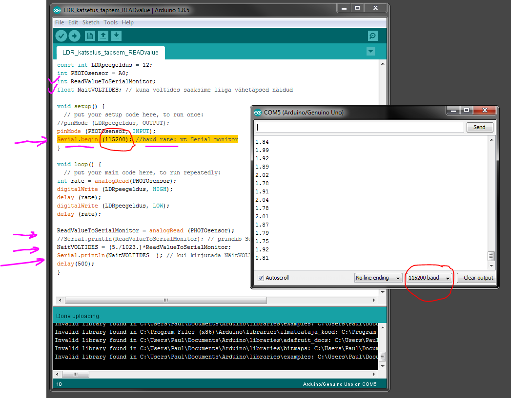 Ent ükskõik kui kiiret sümboliedastust me ka ei vali—valiku teeme olenevalt vajadusest—meie programmis öeldu ja Serial monitorist vastu vaatav peavad olema üks ja seesama infotöötlemise kiirus. Tehke korra proovi—käivitage erinevate väärtustega ja uurige, mis juhtub… Suure tõenäosusega ei pruugi ekraanile tulla mitte midagi või tulevad oodatust erinevad märgid: näiteks mingid kastikesed. Siit teeme järelduse, et alati tuleb probleemide korral järgi vaadata, kas Teie poolt ette antud baudid Teie programmis ning Serial monitori aknas on sama või erineva väärtusega.