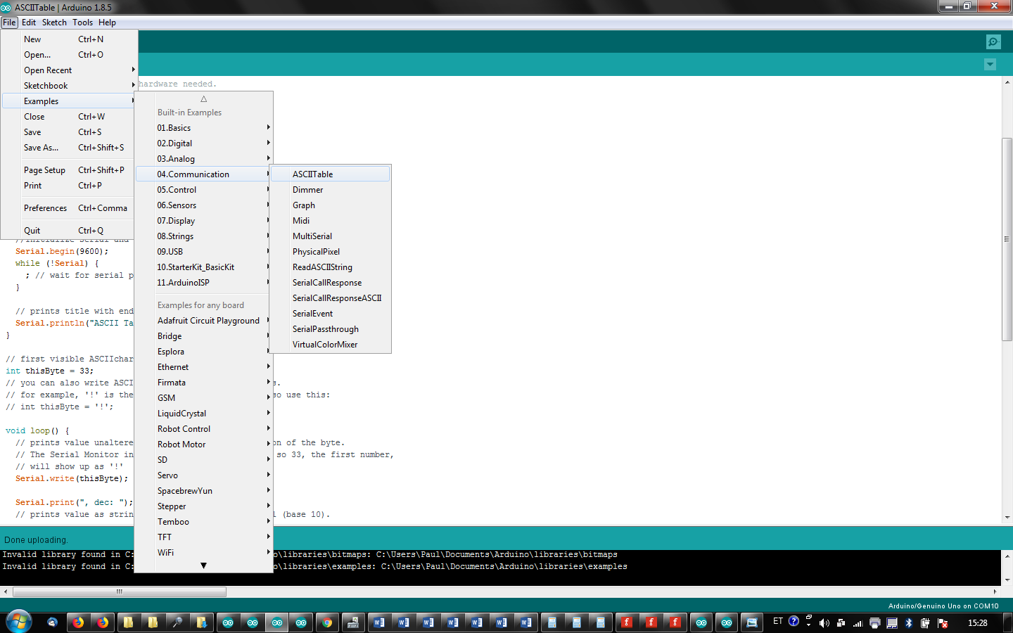 Jooniselt näete, et valides Arduino IDE keskkonnas File-> Examples-> 04. Communications-> ASCII Table saame käivitada programmi. Kompileerime selle, seejärel laeme Arduinole. Antud juhul ei juhtu midagi, ilma et käivitaksime ka Serial monitori. Kui avame Serial monitori, siis prinditakse ASCII sümbolitabeli väärtusi erinevates numbrisüsteemides.