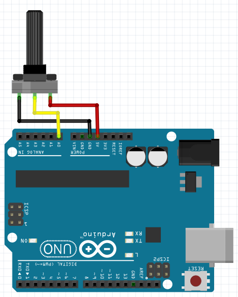 Ühendame GND-GND-ga (must juhe), toiteks anname 5V (punane juhe); analoog-signaali lugemiseks potentsiomeetri keskmiselt viigult aga ühendame selle Arduino A0 viiguga (kollane juhe).