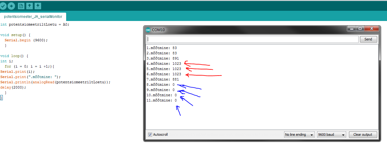 a) soov on lugeda oma käega potentsiomeetri takistust muutes vastavaid näite Serial monitori ekraanilt;