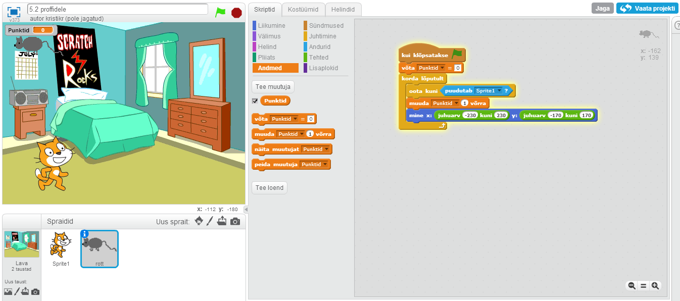 - oskad panna tegelast hüppama suvalisse punkti kasutades menüüst Tehted plokki juhuarv ... kuni ...