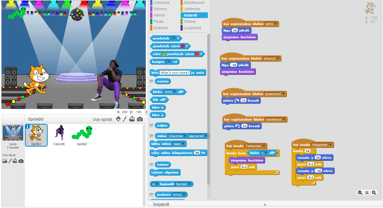 - oskad teha projekti, milles 1 tegelane läheb teise juurde ja teine teatab "Tantsime!" ning kõik tegelased hakkad muusika saatel tantsima.