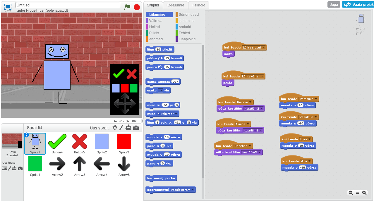 - oskad teha programmi, kus ühele tegelasele klikkides teine tegelane teeb midagi (menüü Sündmused plokk kui spraiti klõpsati ja kui teade ...)